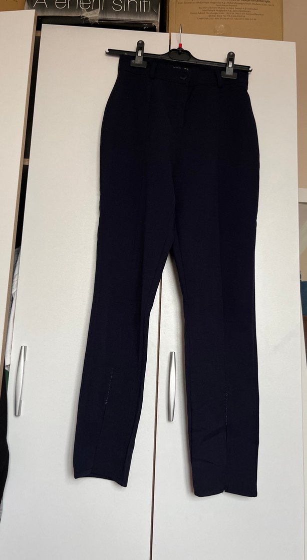 , normal boy, lacivert denim kadın pantolon. Paçası yırtmaçlı kesim ve desen içermeyen sade tasarımıyla ofis kullanıma uygundur paçasında dikiş var siz onu daha da açabilirsiniz