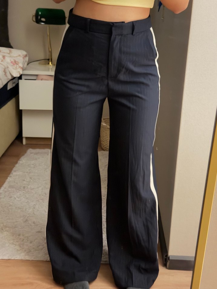 lacivert renk, beyaz şeritli kumaş pantolon