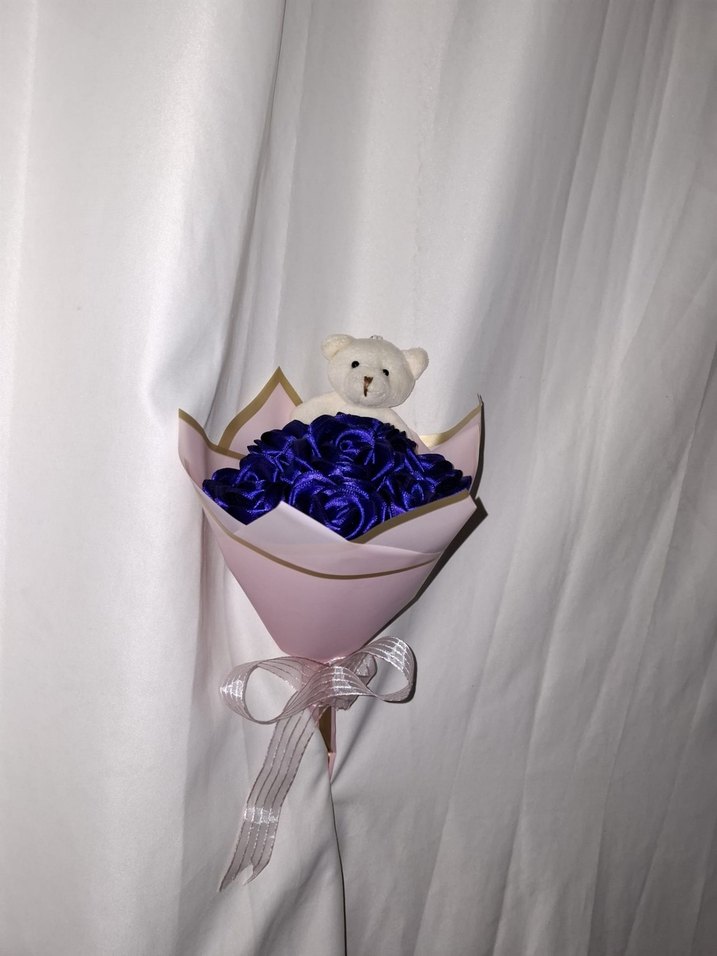 Pembe buket kağıdına sarılmış ayıcıklı, lacivert kurdele çiçek buketi. Sevdikleriniz için solmayacak bir buket. Sipariş alınır.