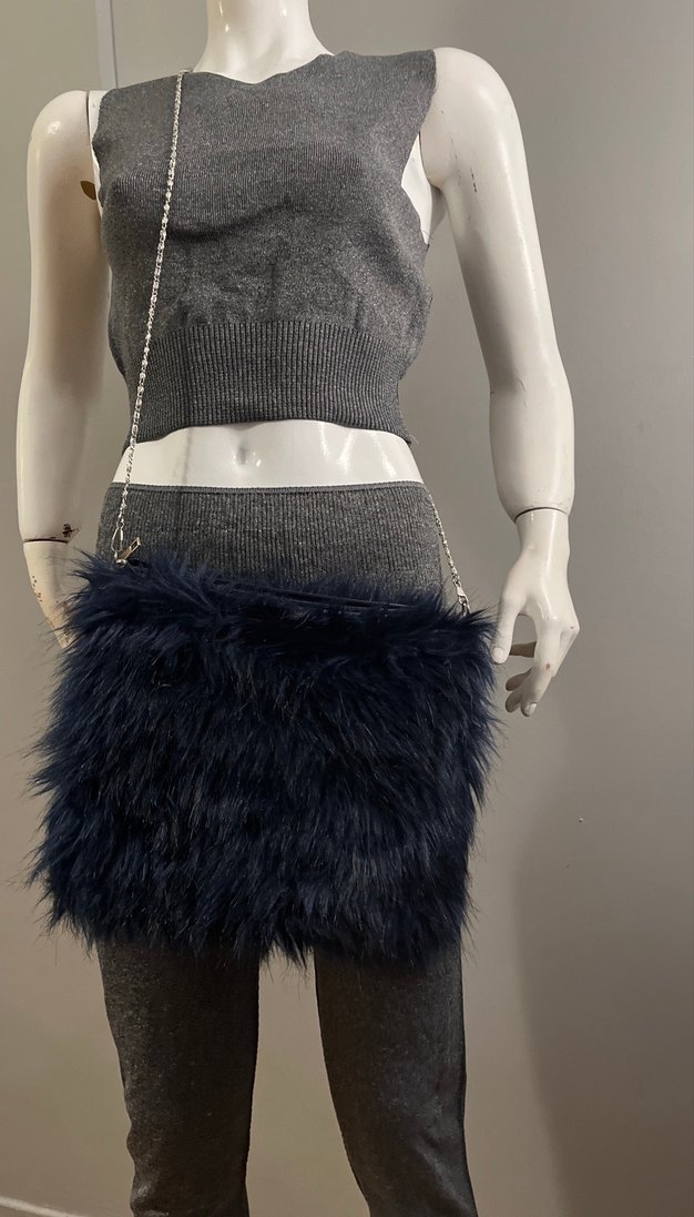 Lacivert Kürk detaylı ve zincir askılı kadın çantası, günlük kullanım için goth tarzında modaya uygun bir üründür.