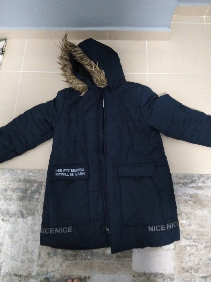 13_14 yaş uyumlu lacivert kürklü kapüşonlu, uzun kollu, baskılı detaylı, normal boyda, fitted kesim kış montu. Notlu yaka ve rahat sokak stiliyle uyumlu. ❄️