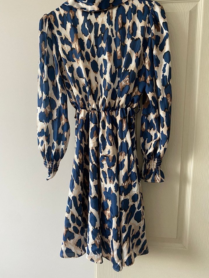 Lacivert leopar desenli, uzun kollu, yakalı ve fırfırlı midi elbise. Rahat kesim, yumuşak sentetik kumaştan, bohem ve retro tarzına uygun.