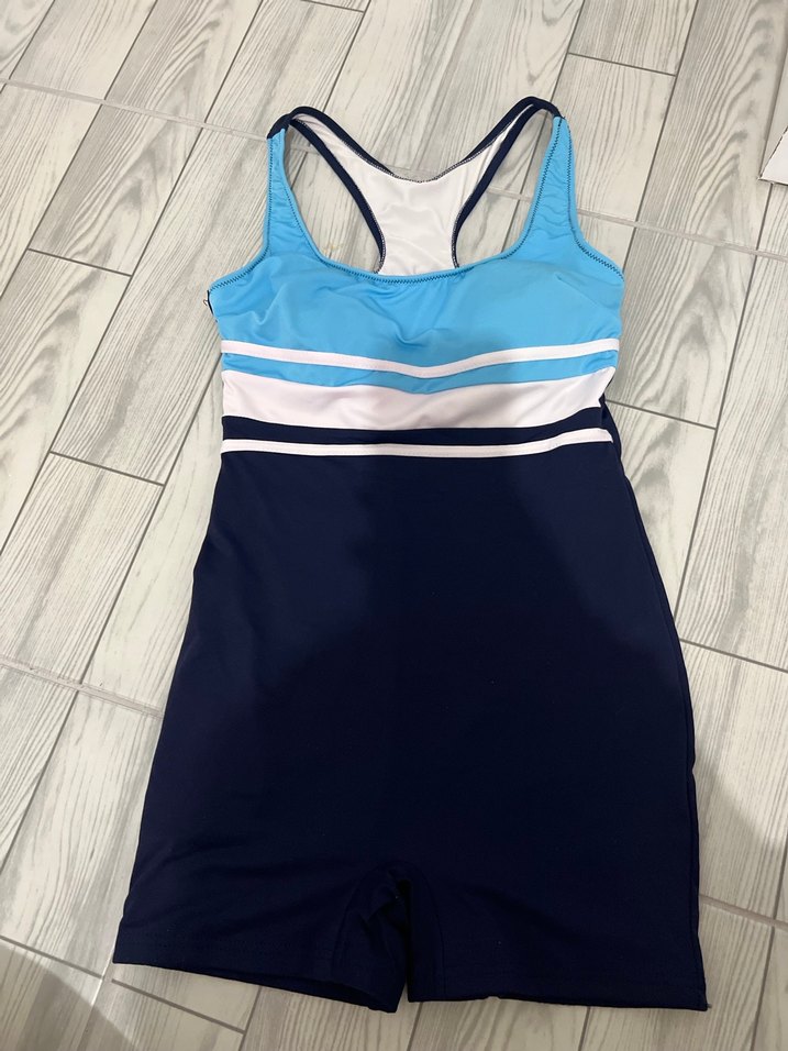 Lacivert ve açık mavi renklerde, elastik destekli, kısa ve kolsuz kadın mayo. Spor ve günlük kullanım için uygundur. ♀️