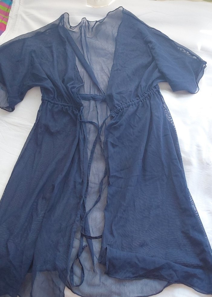 Lacivert renkte, midi boyda, salaş kesim ve kısa kollu olan bohem tarzda kadın elbisesi. Hafif ve transparan kumaştan üretilmiş pareo