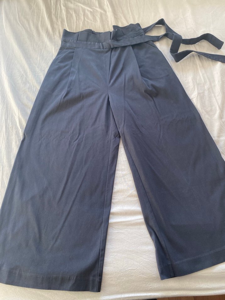 Lacivert renkte, kemerli, bol kesim midi boy kadın pantolon. Rahat ve şık, günlük kullanım için uygun.