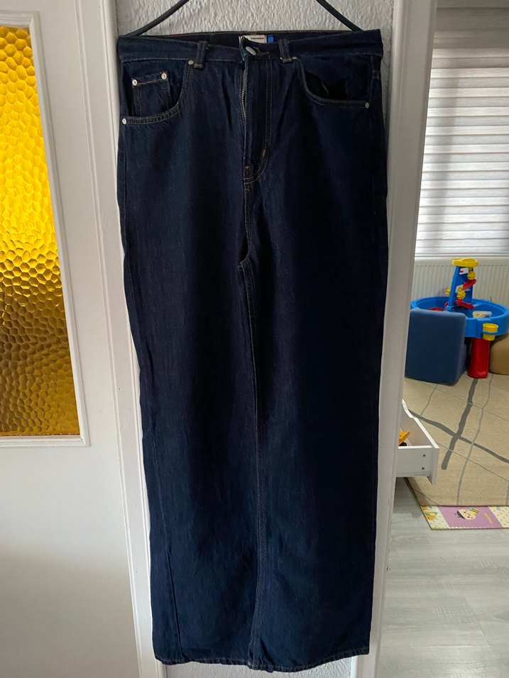 Lacivert midi boy, bol kesim kot pantolon. Sade tasarımıyla rahat ve şık günlük kullanım için uygun.