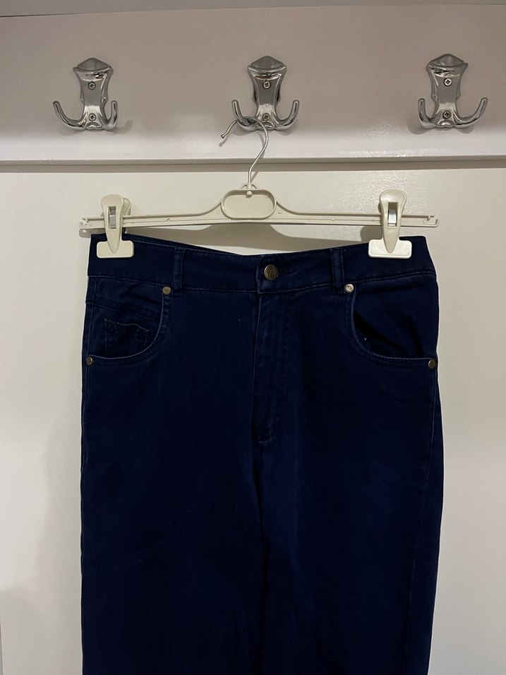 kullanılmamış rahat kumaş Lacivert midi boy, dar kesim kadın jean, sade ve desensiz tasarımıyla günlük kullanım için uygundur.