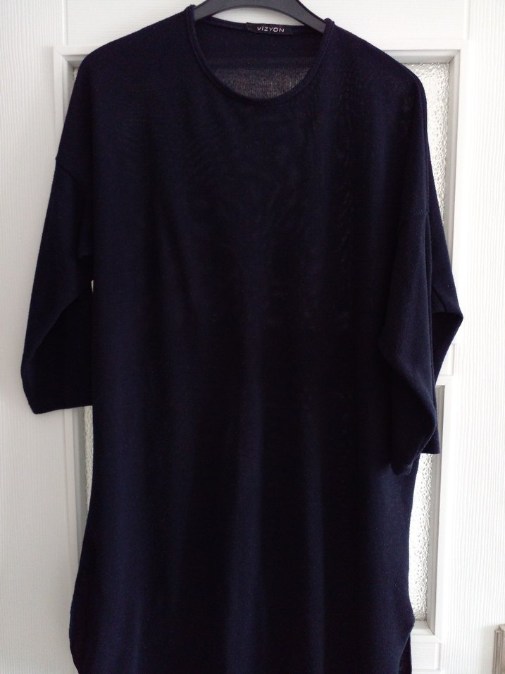 Lacivert kumaştan, uzun kollu ve yuvarlak yakalı midi boy salaş tunik. Dökümlü tasarımıyla minimalist ve normcore tarzda, günlük kullanıma uygun.