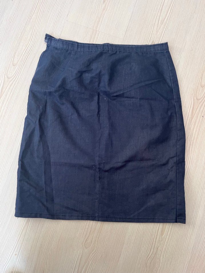Lacivert renkte, midi boyda, düzenli kesim denim etek . Ofis için sade ve rahat bir şıklık sunar.