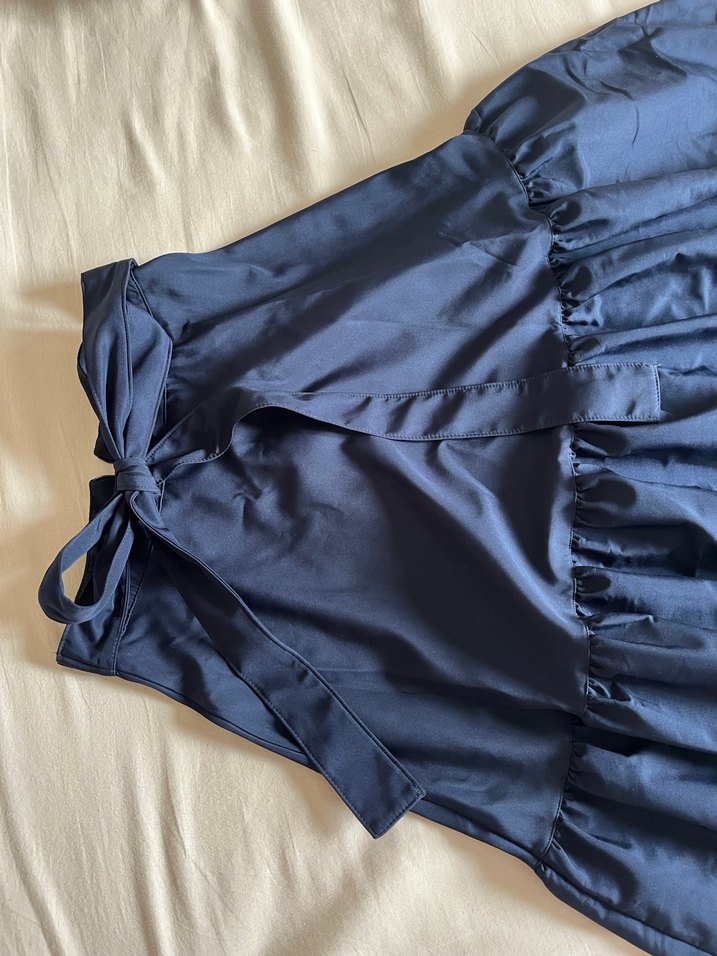 Lacivert midi boy, drapeli ve bol kesim kadın eteği, yumuşak sentetik kumaştan yapılmıştır. Paris tarzı, günlük kullanıma uygundur.
