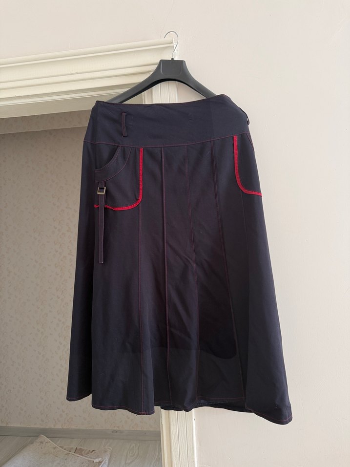 Sentetik kumaştan, cep ve kemer detaylı, kırmızı dikişli lacivert midi drapeli rahat kesim kadın eteği.
