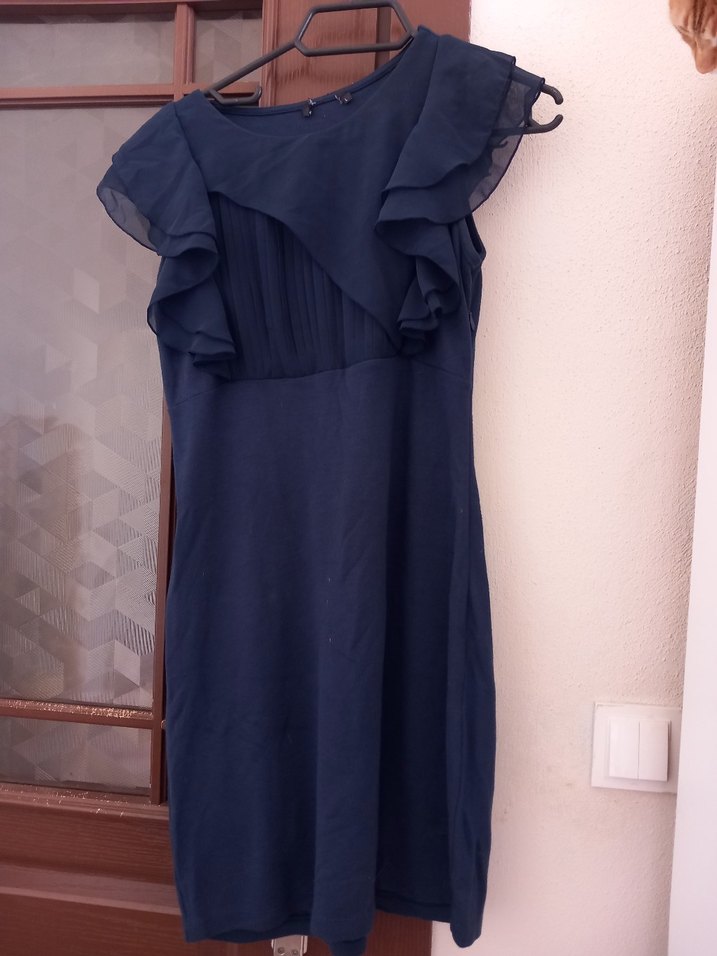 Lacivert midi boy drapeli, omuzları fırfırlı kolsuz elbise. Straplez yaka ve vücuda oturan kesimiyle modern klasik şıklık sunar. ️
