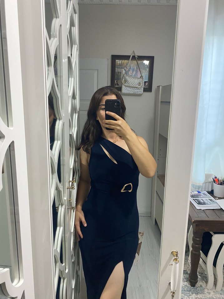 Lacivert ve askılı kollu, yırtmaçlı, ince kesim midi elbise. İpeksi dokusu ve cesur tarzıyla romantik akşamlar için uygundur. 38 beden hiç kullanılmamıştır