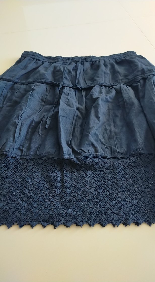 Lacivert midi etek, bol kesim, fırfırlı ve dokulu etek ucu ile. Yumuşak tekstil kumaş, bohem tarzda dış mekan kullanımı için uygun.