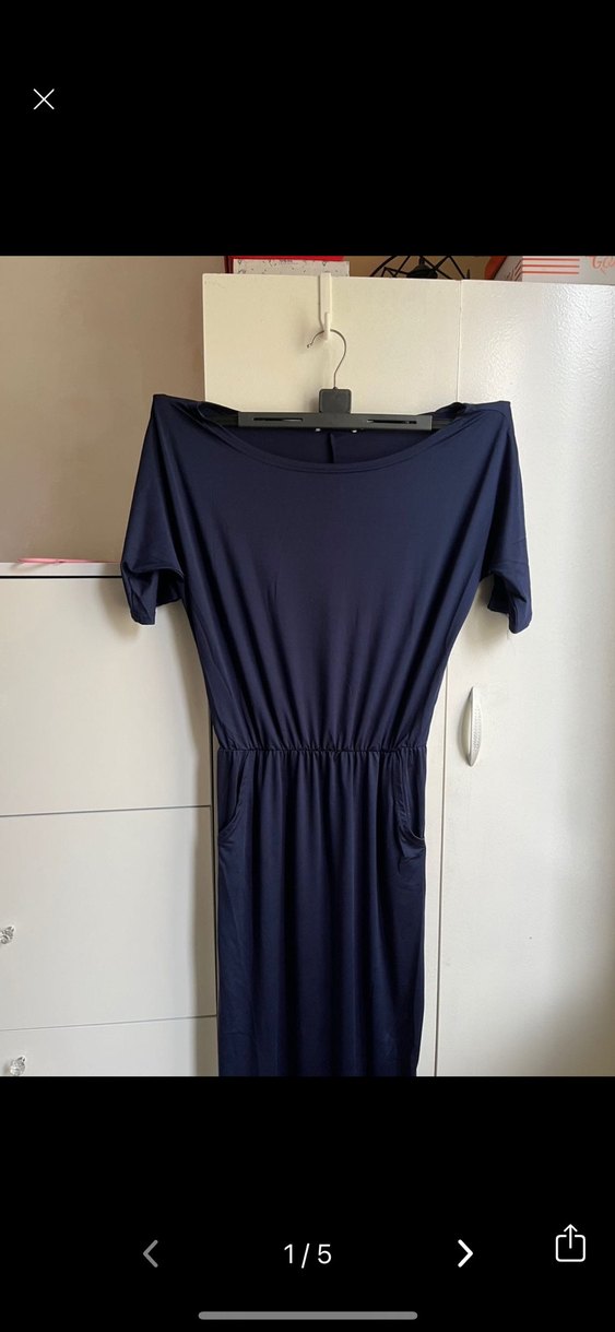 Lacivert yandan yırtmaçlı, yarı straplez yaka cepli riklalı elbise #elbise #lacivertelbise