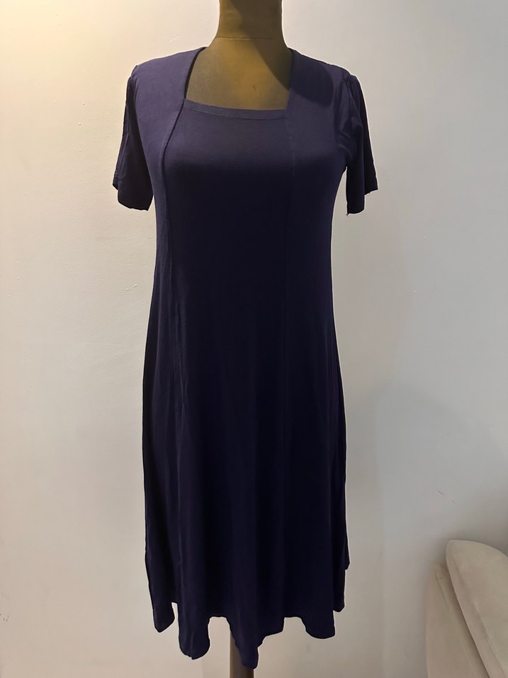 Lacivert renkte, kısa kollu ve kayık yakalı hamile elbisesi. Rahat kesimi ve ipeksi kumaşıyla günlük kullanıma uygundur. Desensiz, minimal ve sade tarzda.