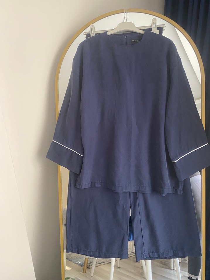 Lacivert renkte, bol kesim ve drapeli detaylı ikili takım. Uzun kollu ve minimal tarzda, rahat bir kullanım sunar.