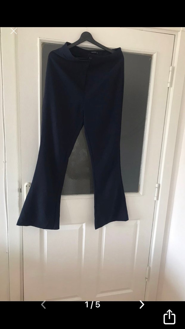 Lacivert midi boy, regular kesim ve yırtmaç detaylı denim kumaş pantolon. İş ortamına uygun, desen içermeyen şık ve rahat bir model. Boyu109cm