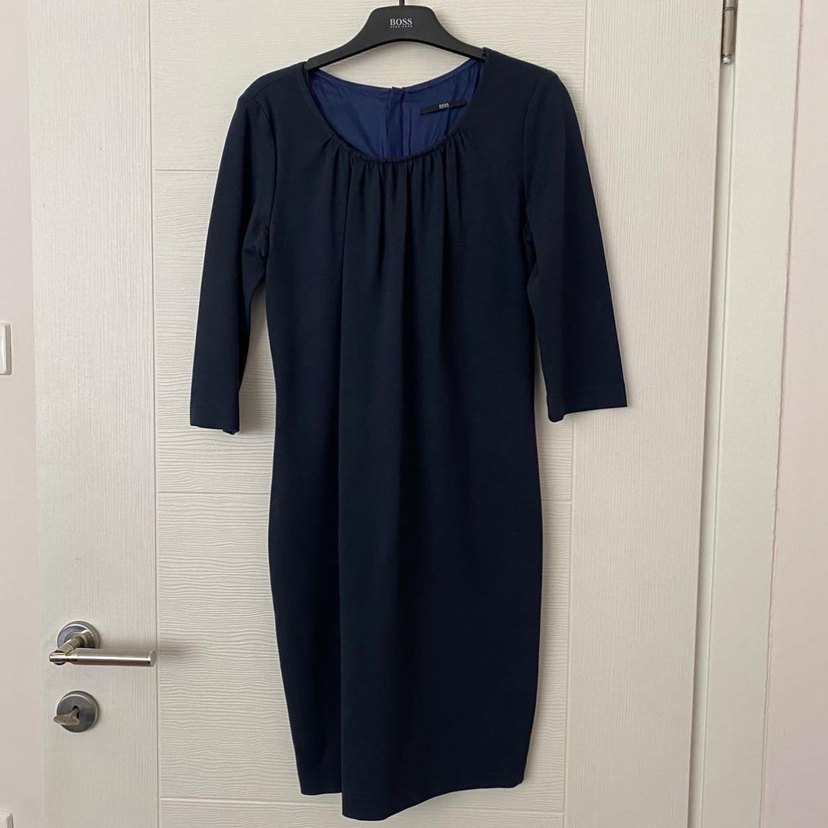 Lacivert midi elbise, uzun kollu ve yuvarlak yakalı. Pilili detaylarıyla klasik ve iş ortamına uygun, rahat kesim. Orjinal üründür. 1 kere kullanılmıştır.