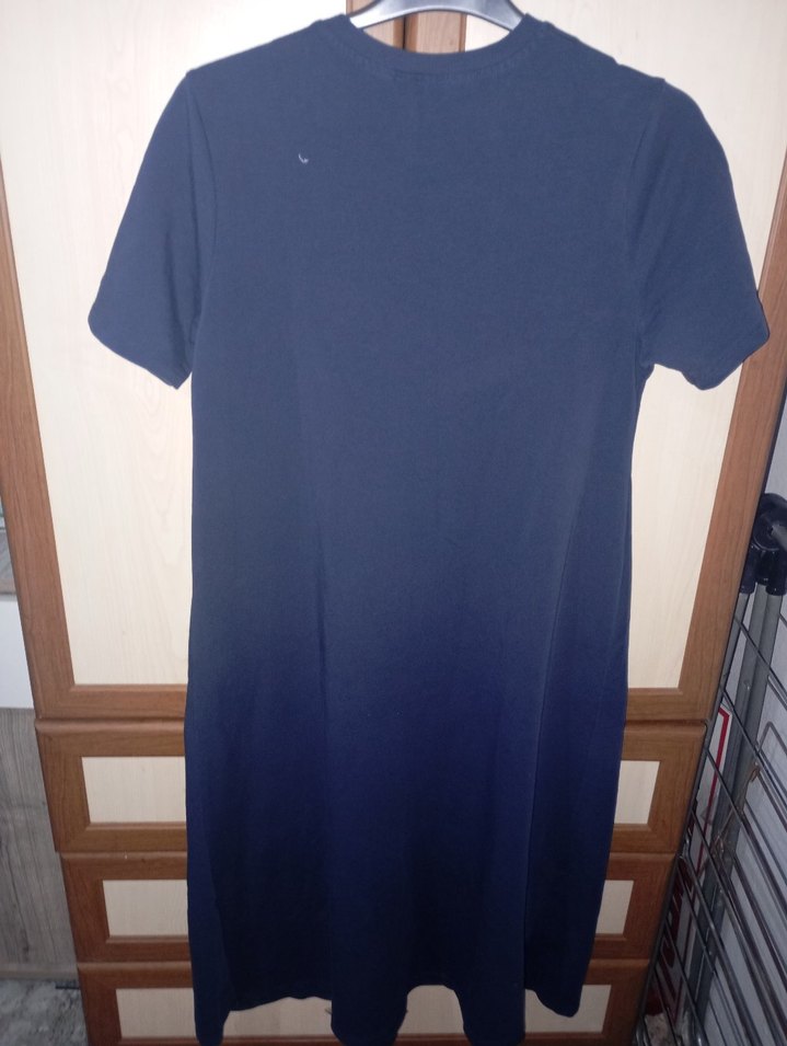 Lacivert midi elbise, kısa kollu ve yuvarlak yakalı, bol kesim ve yumuşak sentetik kumaştan. Günlük rahat sokak modasına uygun, zahmetsiz şıklık sunar.