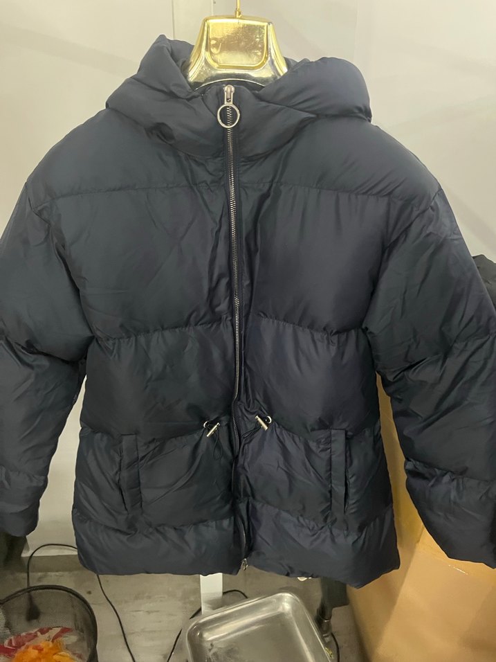 Lacivert midi uzunlukta, fermuarlı ve kesimli yakalı kadın kışlık mont. Sıcak ve yumuşak kumaştan, sokak stili ve rahat kullanım için uygundur.