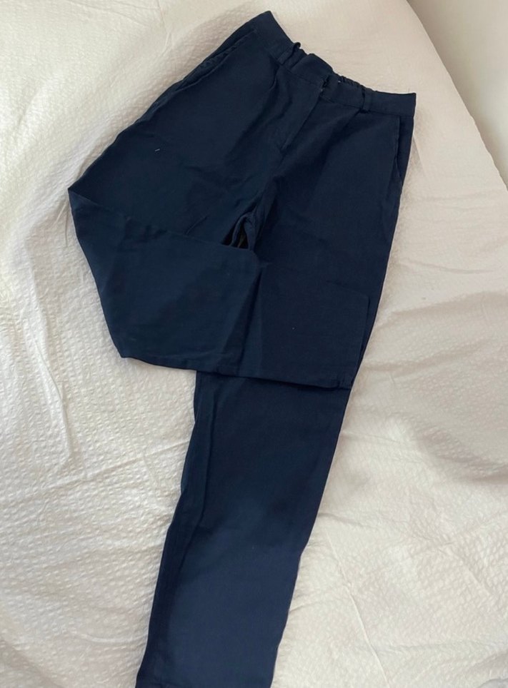Lacivert midi kadın kumaş pantolon, düz tasarımlı ve sentetik kumaştan, günlük kullanım için rahat ve şık bir seçenektir.
