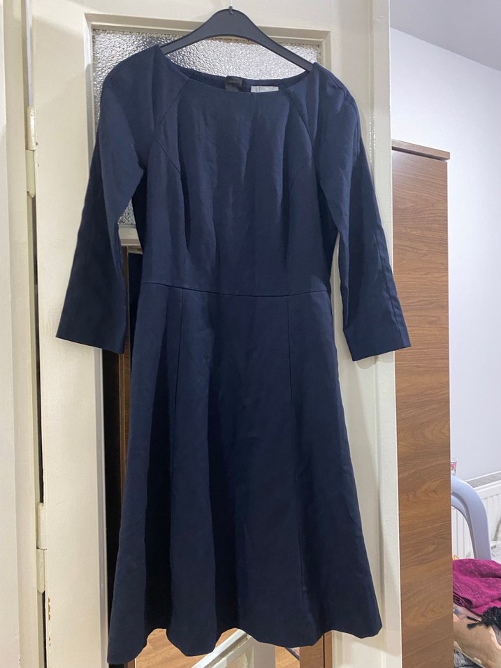 Lacivert midi elbise, uzun kollu ve kesik yakalıdır. Pilili etek detayına sahip, klasik ve ofis şıklığı için uygun bir modeldir. Bir sorunu yoktur