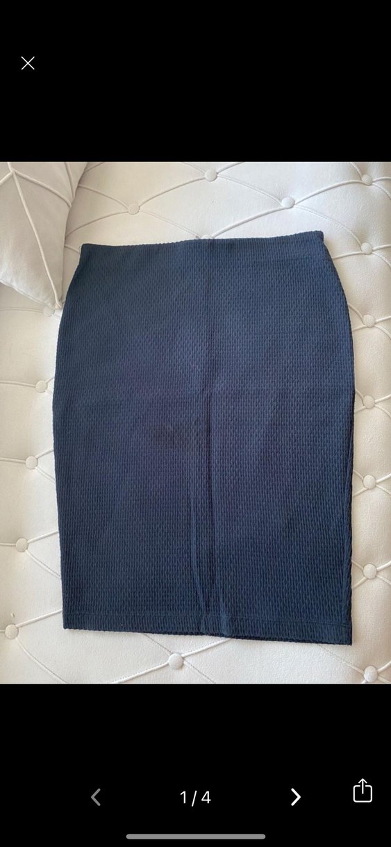 Koyu lacivert midi kalem etek, pilili detaylarla ve düz sentetik kumaştan yapılmıştır. Ofis kullanımı için uygun, sade ve normcore tarzında. Fermuarşı l beden