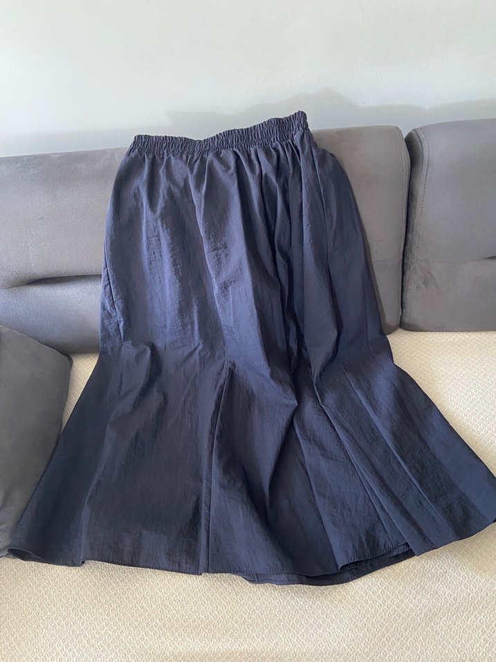 Lacivert midi boy keten kumaştan, salaş kesim ve drapeli tasarıma sahip, bel kısmı lastikli etek. Günlük kullanım için uygundur.