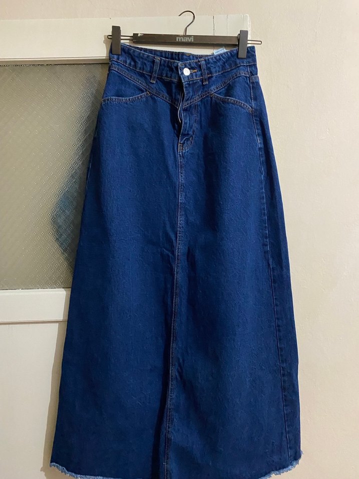 Lacivert midi kot etek, bol kesim ve sade desensiz tasarımıyla günlük kullanıma uygun rahat bir şıklık sunar.