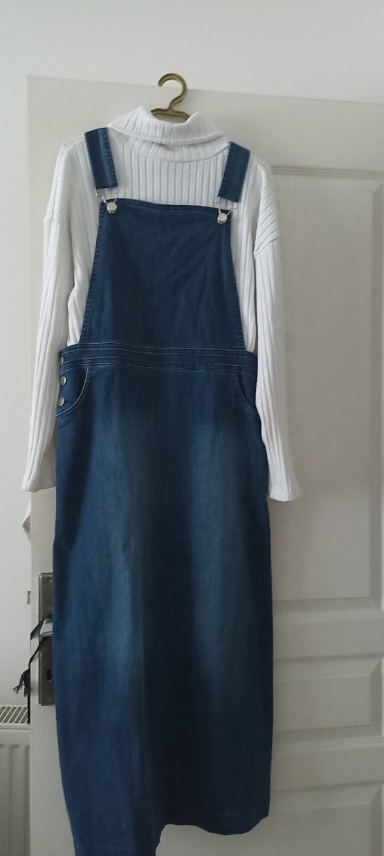 Lacivert midi kot tulum, bol kesimdir. Askılı ve kolsuz yapısıyla günlük kullanıma uygundur.