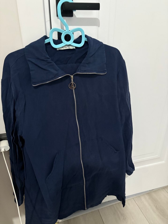 Lacivert, bol kesim ceketi keten kumaştan, yakalı ve uzun kolludur. Fermuarlı ve minimal tasarıma sahiptir, günlük kullanım için uygundur.