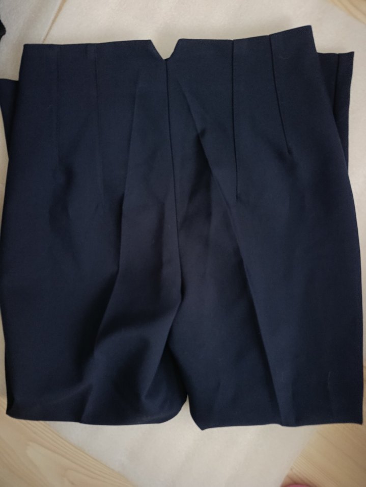 Lacivert renk, pilili ve normal boy midi kadın kumaş pantolon, iş ortamına uygun düz kesim ve sentetik kumaştan.