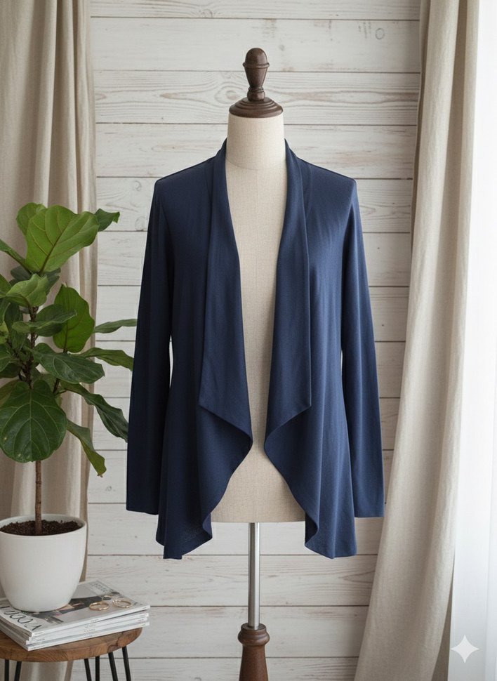 Lacivert renkte, yakalı ve drapeli ön kısımlı hamile ceketi. Normal kesim, uzun kollu ve midi boydadır. Minimalist tarzıyla ofis ve günlük kullanıma uygundur.