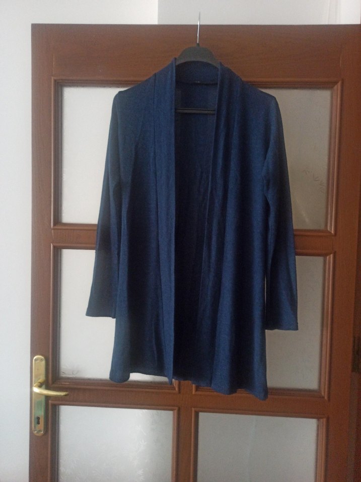 Lacivert renkli hırka, uzun kollu ve yakası kesimli. Rahat dökümlü kesimiyle günlük kullanıma uygun minimalist tarzda.