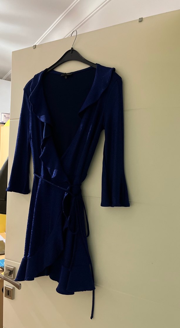 Lacivert midi boy, uzun kollu, vücuda oturan, kuşaklı ve fırfırlı detaylara sahip Paris tarzı kadın elbisesi.