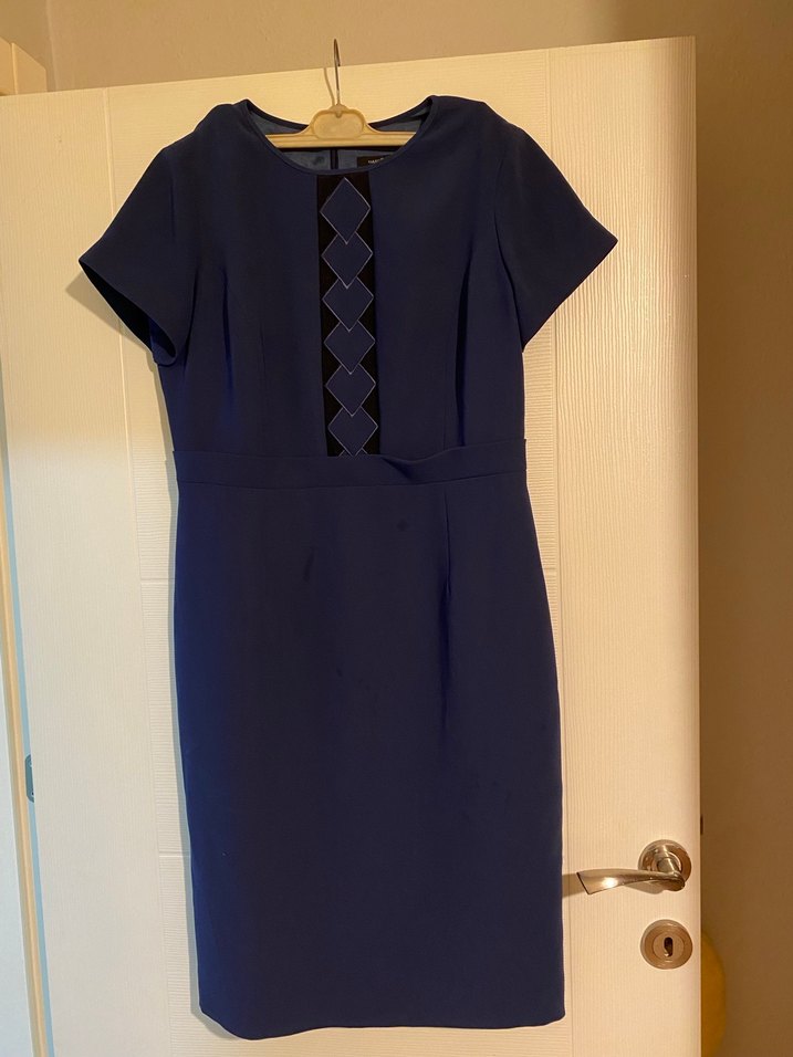 Lacivert midi elbise, V yaka ve kısa kollu, kemerli ve sade gotik esintili tasarıma sahip. Ofis kullanımı için klasik ve şık stil.