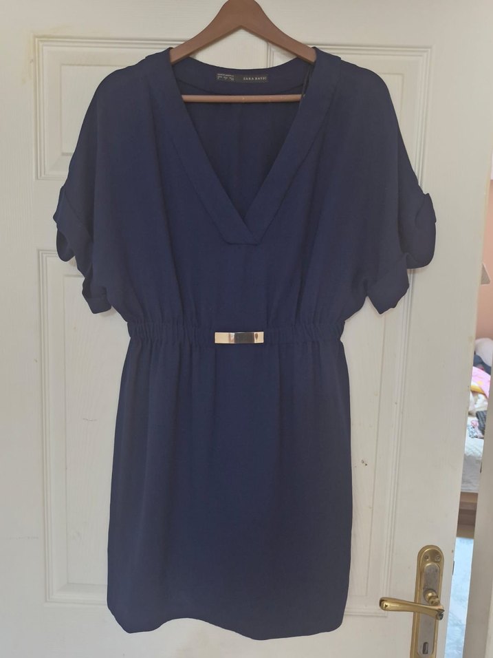 Lacivert midi boy, V yakalı ve kısa kollu, kemerli, bol kesim elbise. İpek gibi yumuşak kumaştan, ofis için uygun. 38 beden