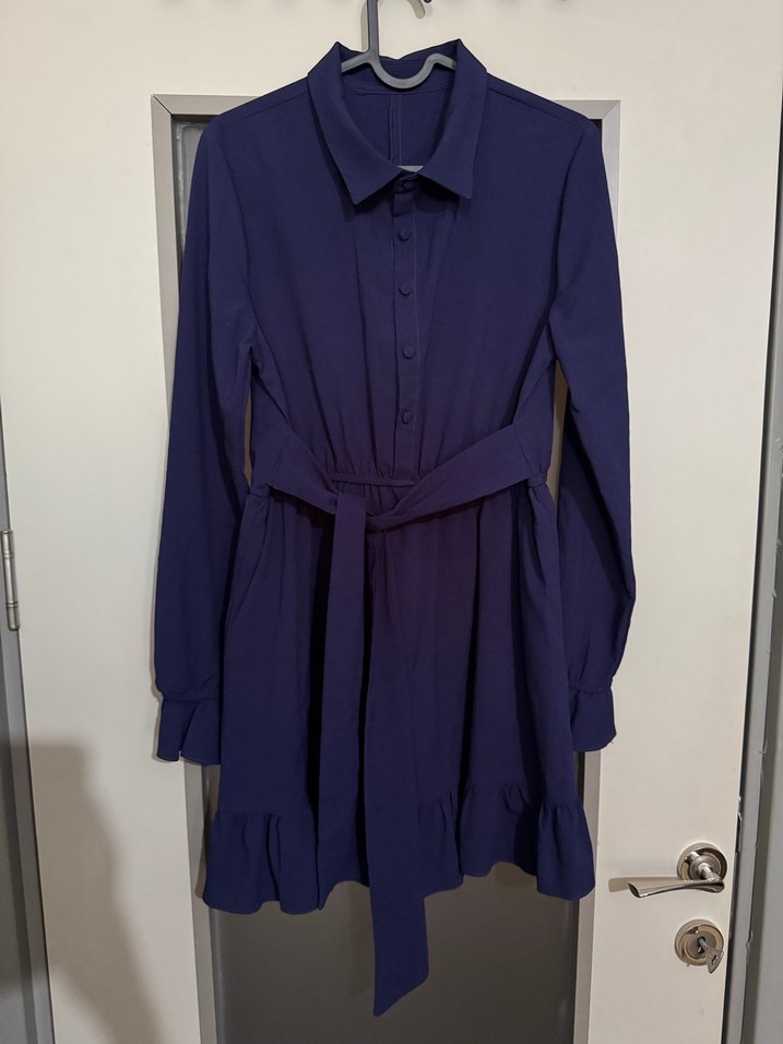 Lacivert renkli mini boy elbise, uzun kollu, yakalı ve düğmeli. Bel bağlamalı ve volanlı etek ucu ile rahat kesim, ofis veya günlük kullanım için uygun.