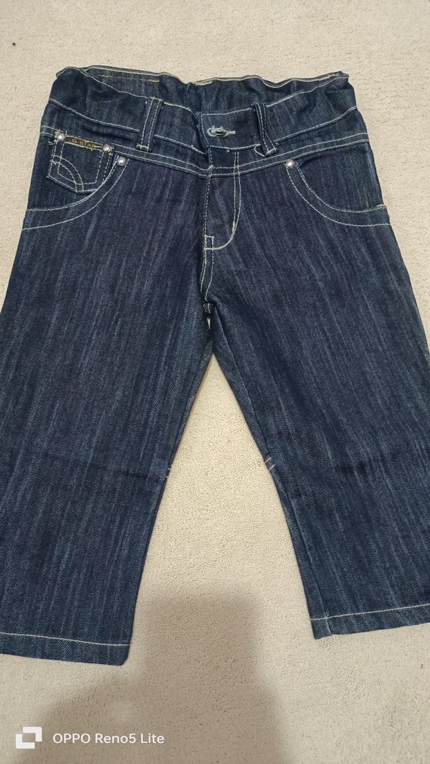 çocuklar için kemerli, regular fit ve kısa boyda, lacivert renkte günlük kullanıma uygun kot kapri pantolon.