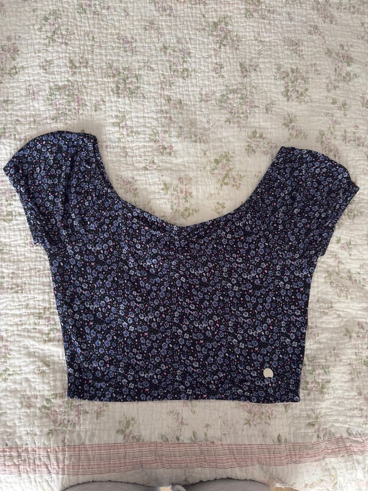 V yaka kısa kollu, mini uzunlukta, lacivert çiçek desenli kadın bluz. Kumaşı çok rahat, terletmeyen, bohem tarzda bir bluzdur.