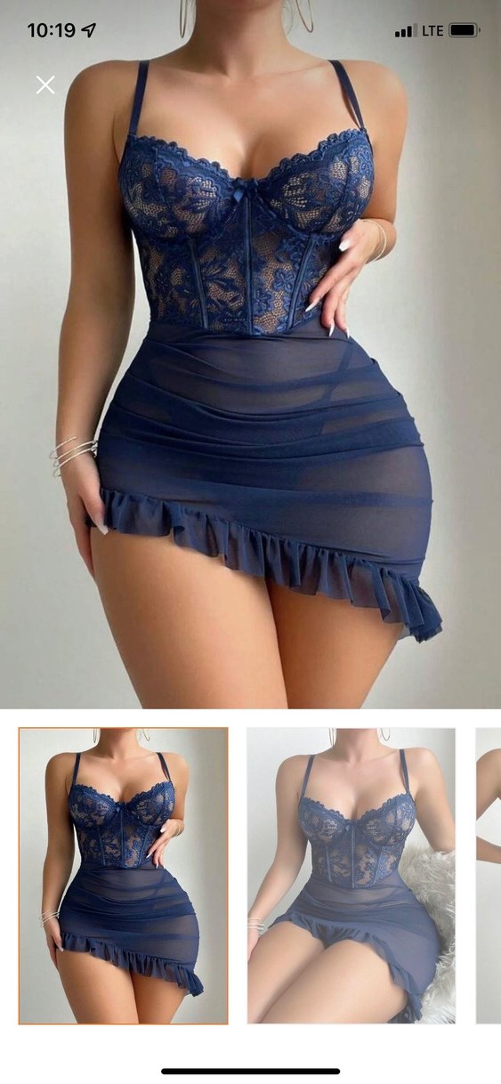 Lacivert renkli, baskılı dantel detaylı, askılı ve vücuda oturan mini boy gecelik takımEtek kısmı fırfırlı, gotik tarzda şık bir tasarım. Hiç kullanmadım kalıbı biraz dar görselin aynısıdır