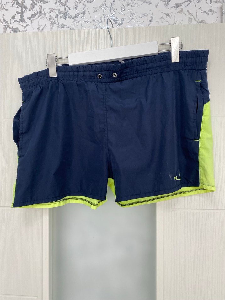 Koyu lacivert ve neon sarı yan detaylı, kemerli, mini kesim erkek mayo şort, plajda şık ve rahat kullanım sağlar.