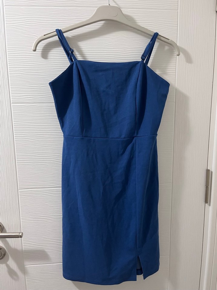 Lacivert renkli mini elbise, ince askılı ve straplez yakalıdır. Düz, drapeli tasarıma sahip, vücuda oturan kesim ve midi boydur. Günlük kullanıma uygundur.
