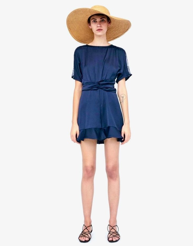 Çok şık..Harika bir kumaşı var..dış ve ense etiketi yok..fakat kullanılmamıştır..Lacivert mini kadın elbise, kısa kollu ve straplez yakalıdır. İpeksi kumaştan, rahat kesimli ve desen içermeyen tasarımıyla günlük sokak stili için uygundur.