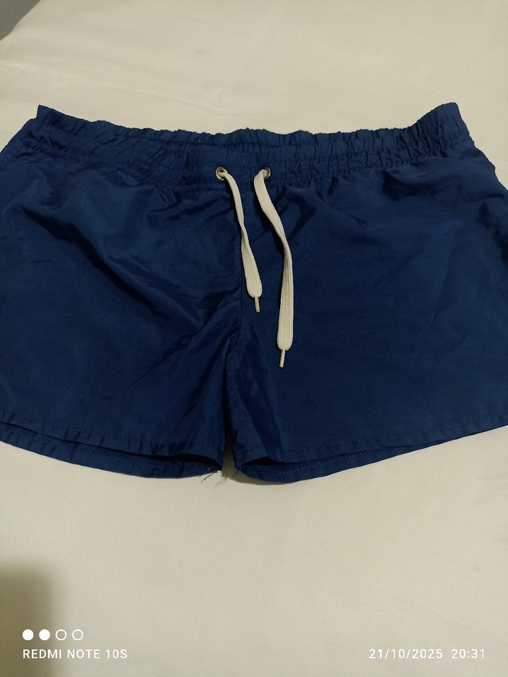 Lacivert, kısa boy, bol kesim, düz tasarımlı kadın mayo, elastik bel ve bağcıklı. Plaj ve sokak stili için uygun.