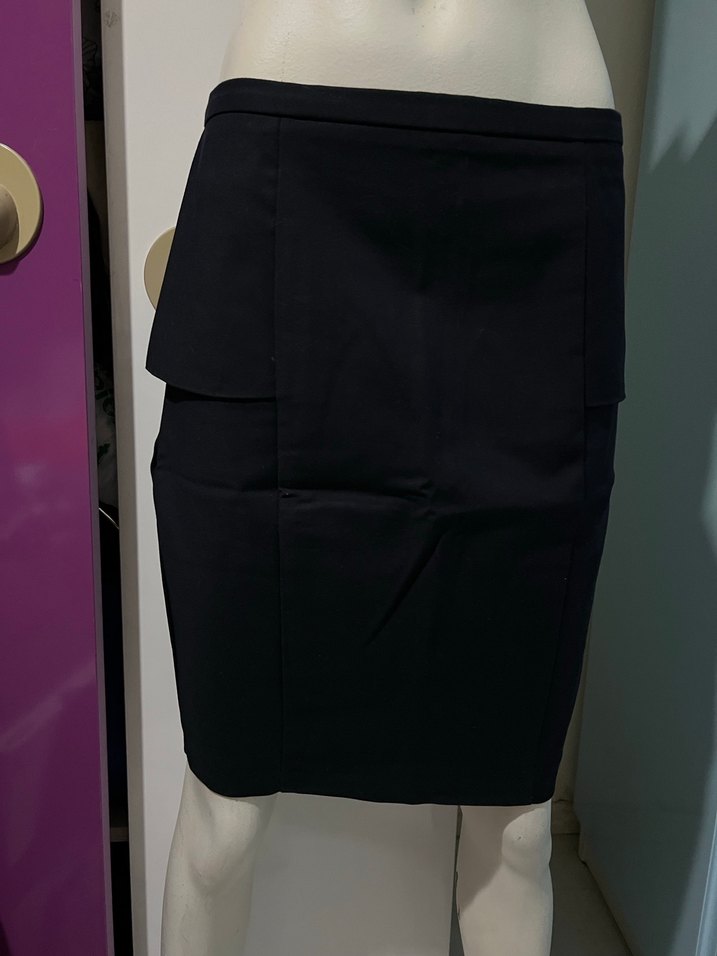 Lacivert renkte, düz tasarımlı mini kalem etek. Sentetik kumaştan, düzenli kesimle ofis ortamına uygun gotik tarzda.