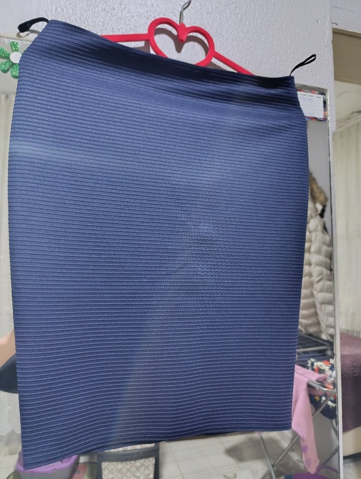 Mavi sentetik kumaştan, pilili ve normal uzunlukta, dar kesim hamile eteği. Günlük sokak stili için uygundur, şık ve modern bir görünüme sahiptir.