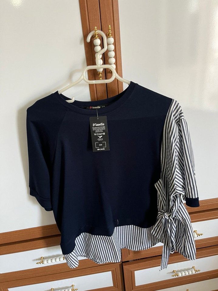 Kadın ikili takim kısa kollu, yuvarlak yakalı ve bol kesimdir. Lacivert düz kumaş ile çizgili baskılı pilili detaylar bir arada. Yumuşak sentetik kumaştan, günlük kullanım için uygundur.