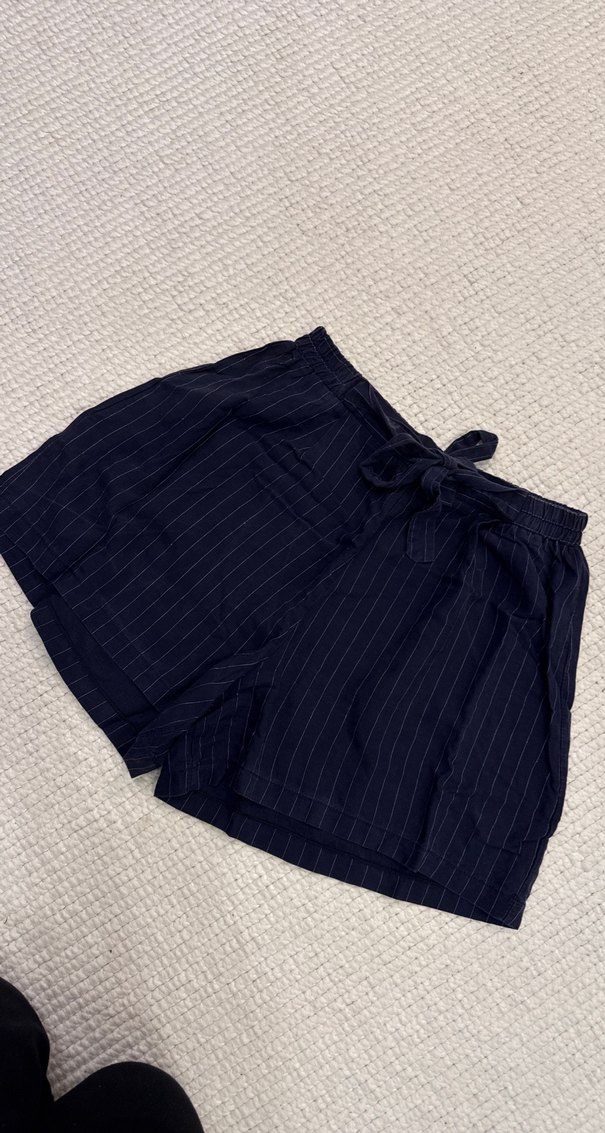 Yumuşak keten kumaştan, pilili ve bol kesim lacivert mini şort. Kısa boy, desensiz, rahat ve şık ofis kullanımı için uygun.